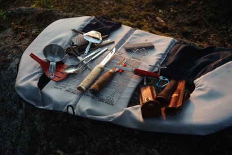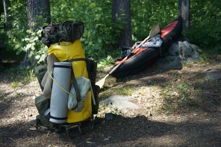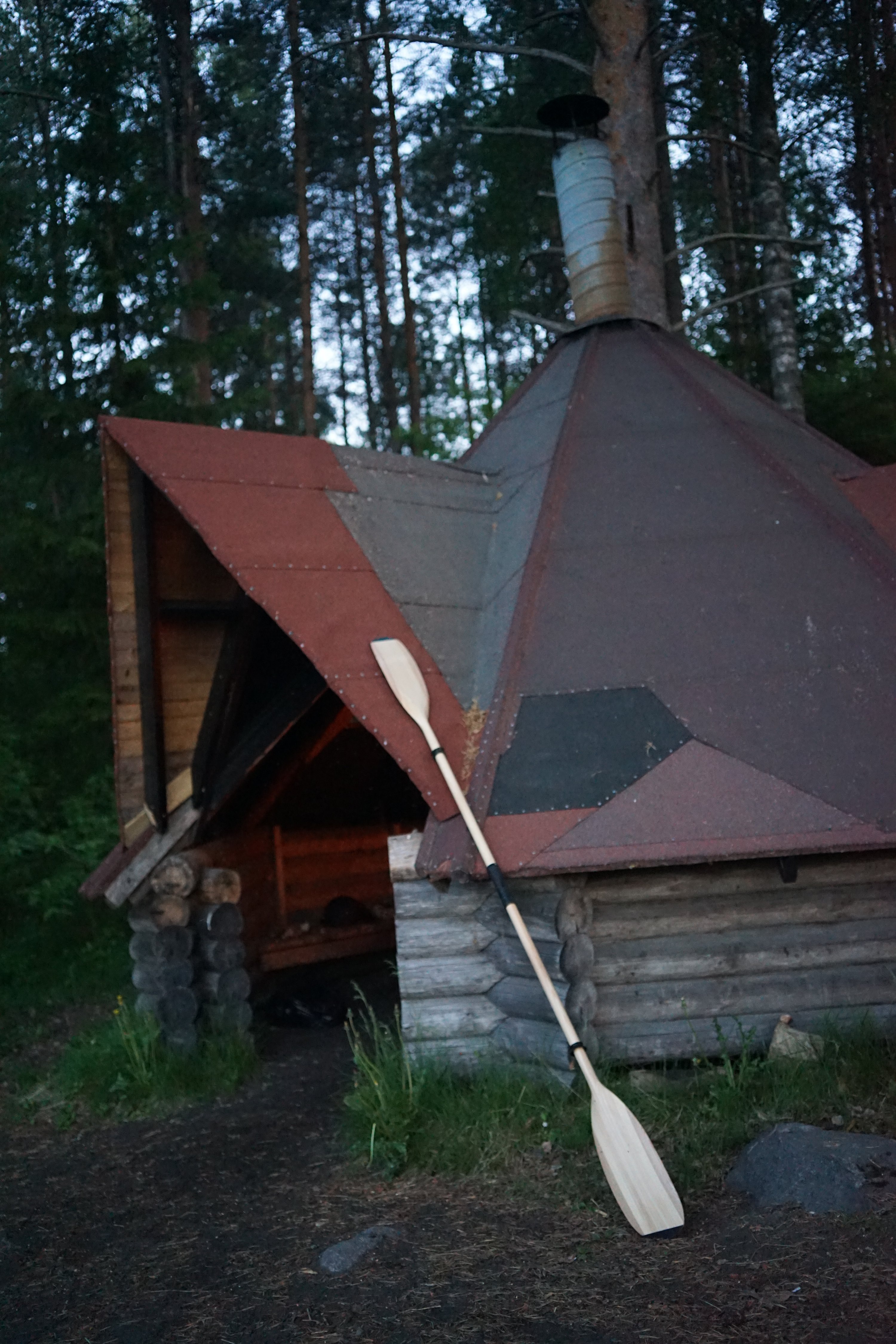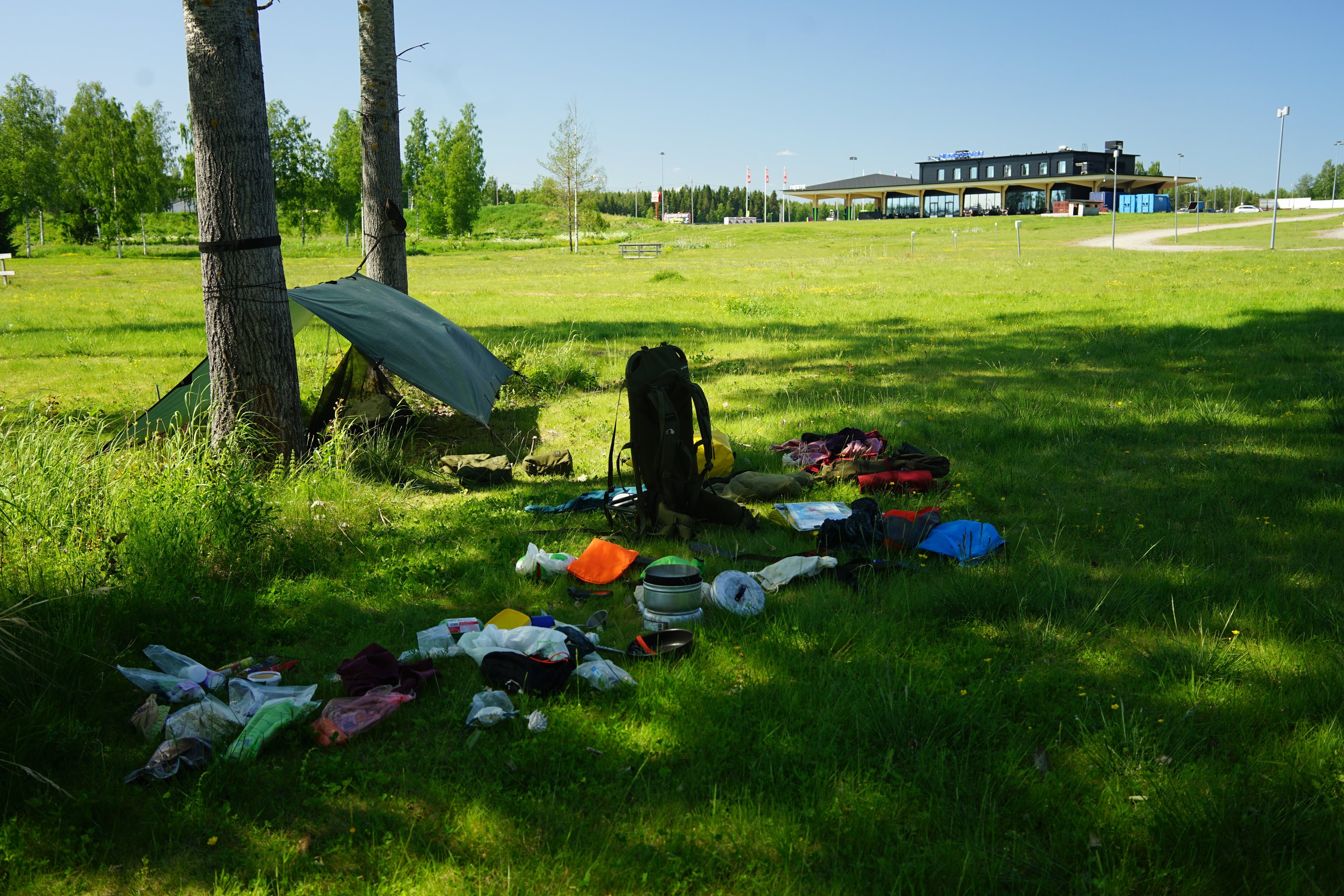 In the morning I left the boat at the kota and walked to "Finland's best petrol station 2017" — Niemenharju. I pitched the tarp as a tent and went through my gear. I also tried to eat as much of the pre-made tomato sauce as possible so I wouldn't have to carry it. Then I retrieved the boat and inspected the damage.