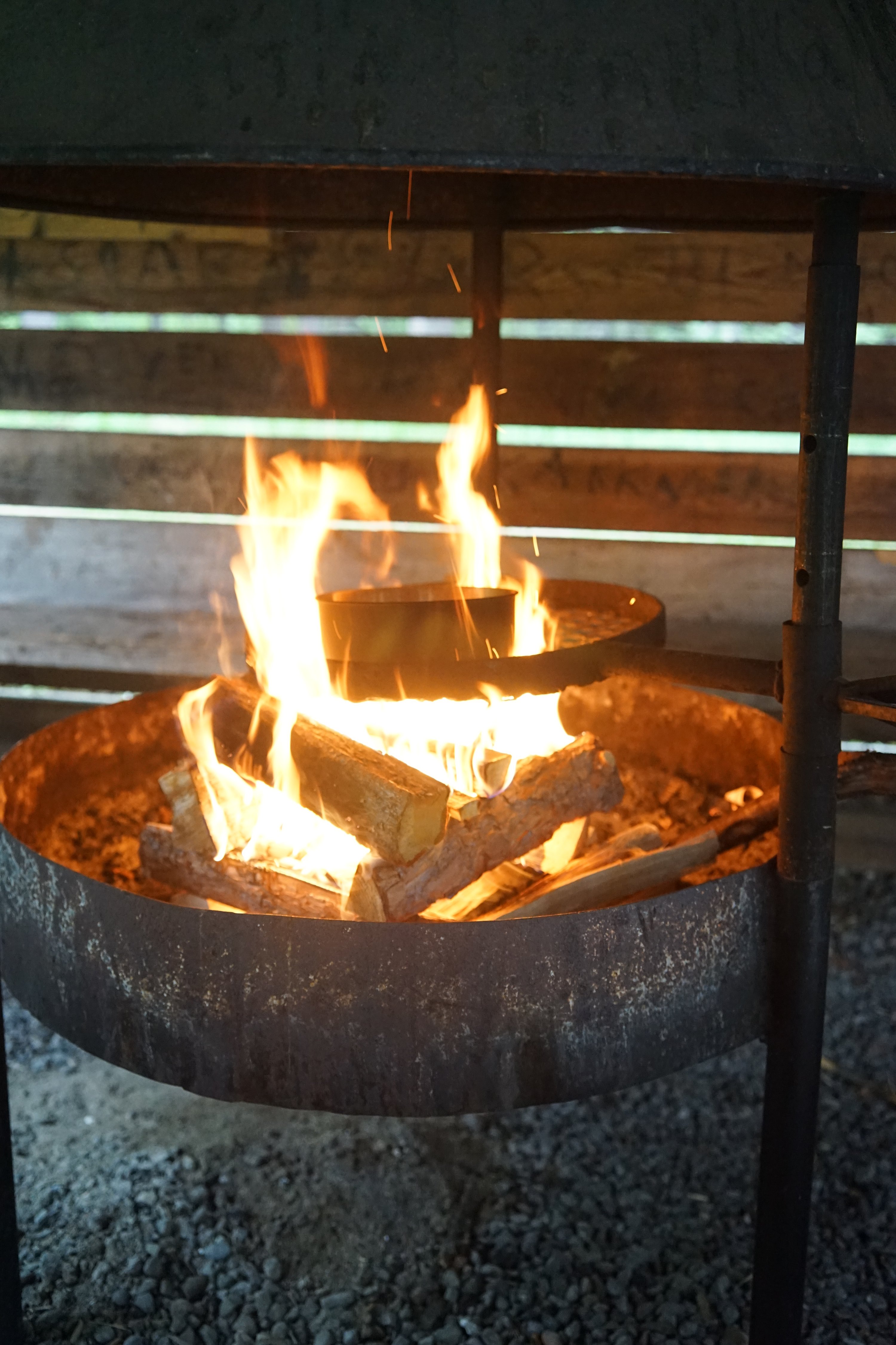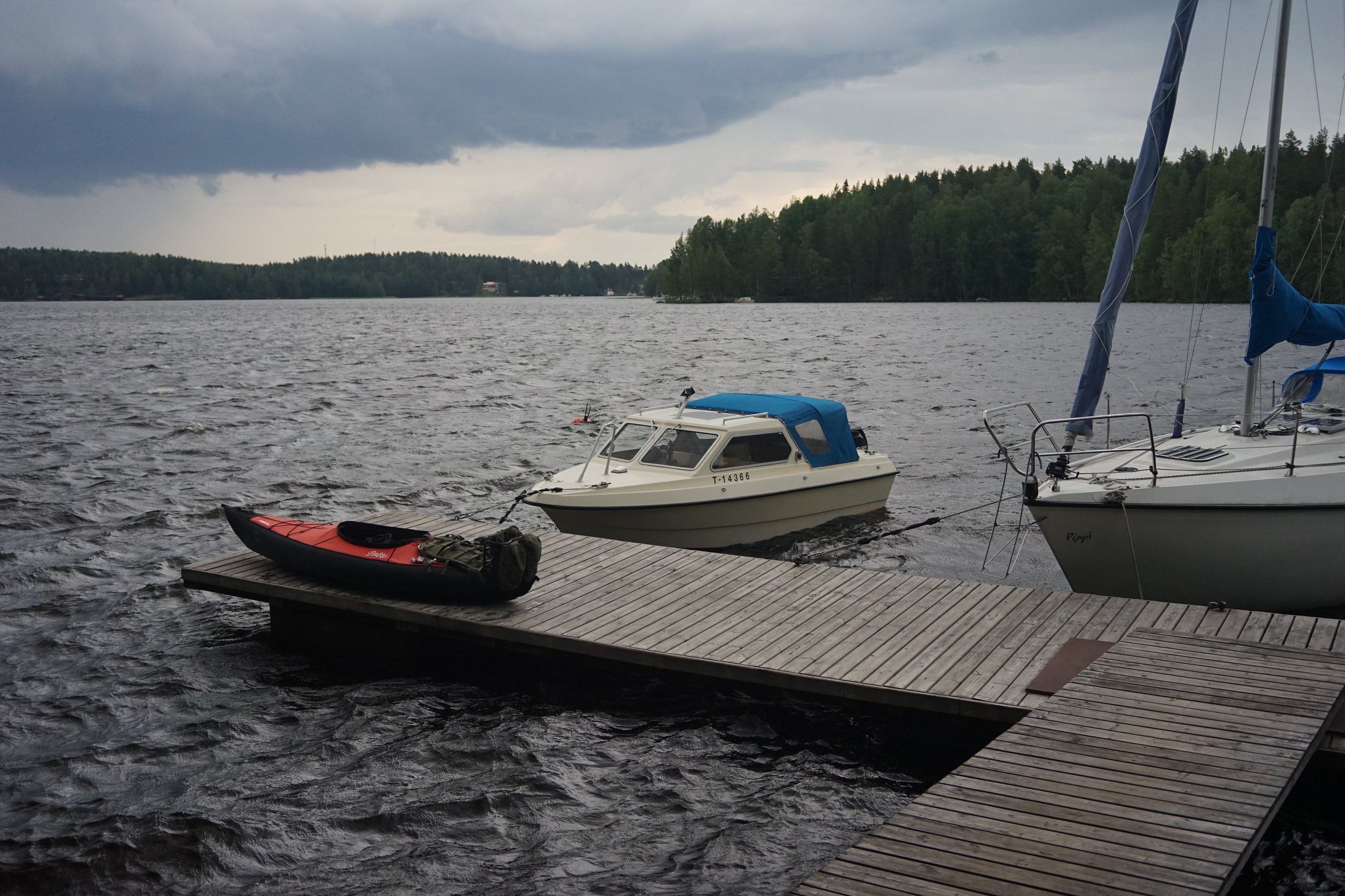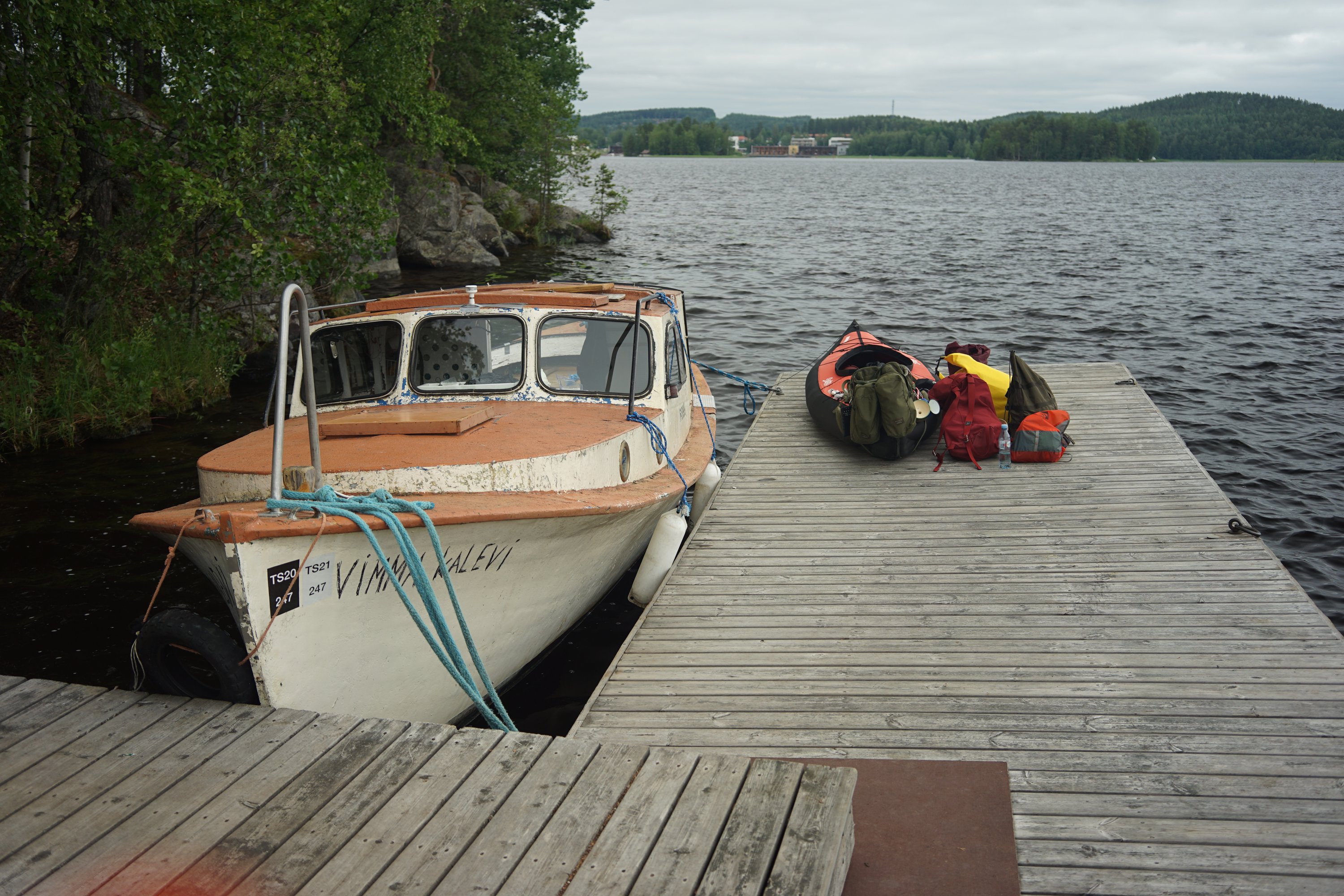 I paddled toward Laukaa with thunder creeping behind me again. I made it to the harbour café before the storm. I ate there calmly while waiting out the weather. Probably only a couple of hours before I was moving again. From there to Kuhankoski, where I portaged the kayak around the lock — it felt so claustrophobic after the open water. Then another boring long lake, and after that Kuusisaari. A good jetty and cooking spot there, but the lean-to woodpile was nearly empty — just a euro pallet sawn into pieces.