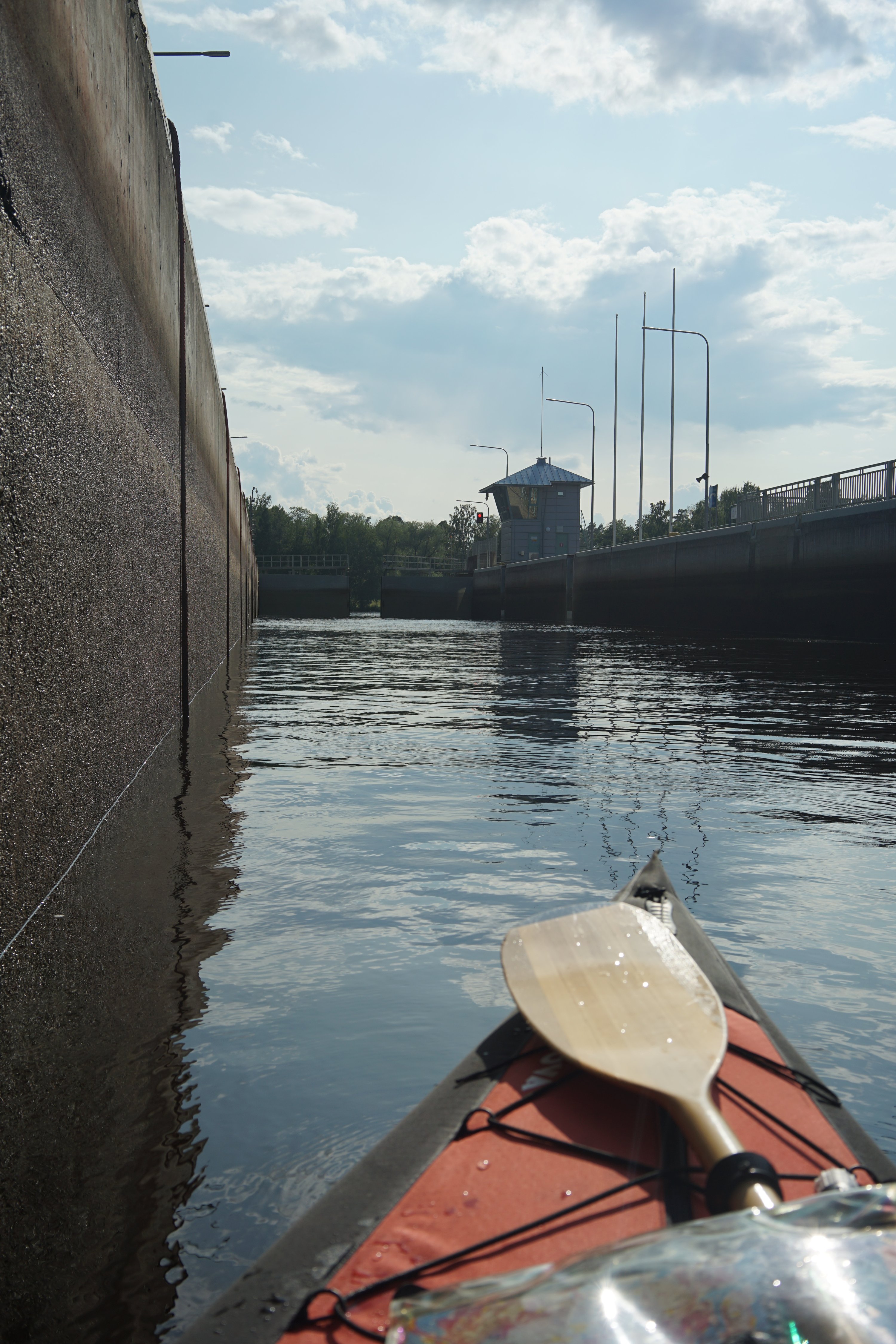 After a relaxed morning I continued toward Jyväskylä. I stopped at Naissaari for coffee and a pastry. This time I decided to try going through the lock. A motorboat came along at the same time. On the way out I got positive comments from the shore — they apparently appreciated the kayak's long-distance cargo heap.