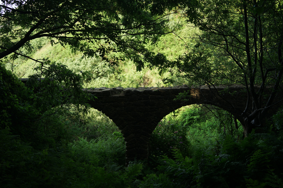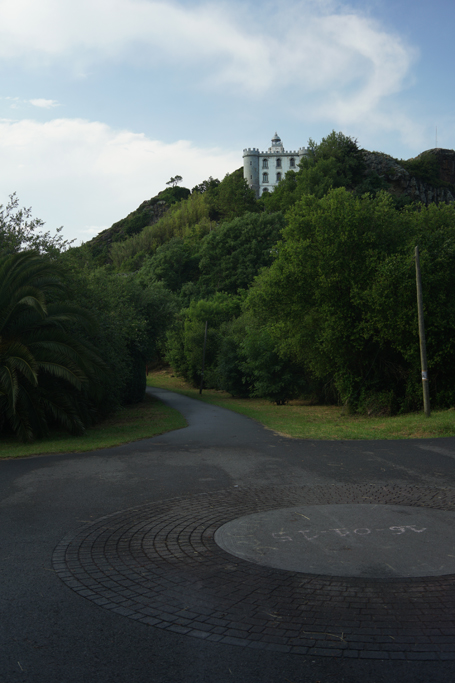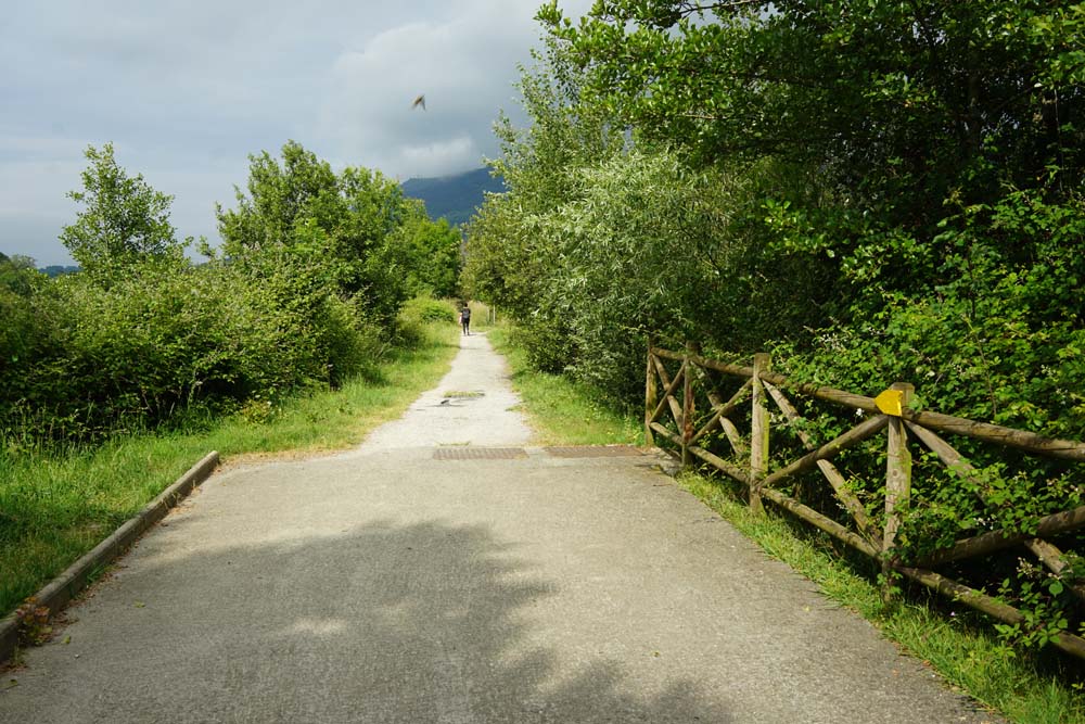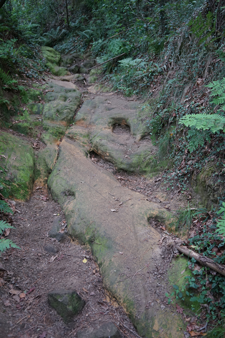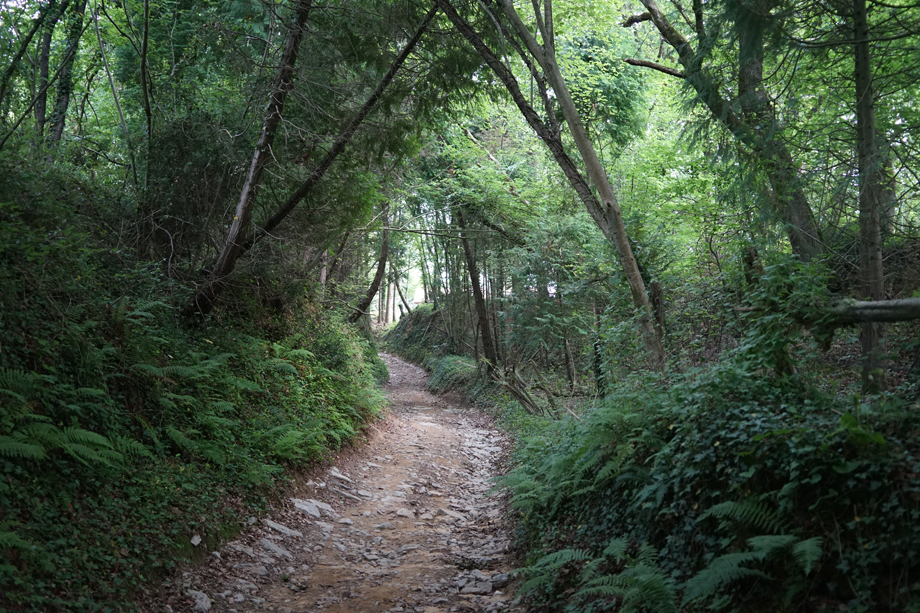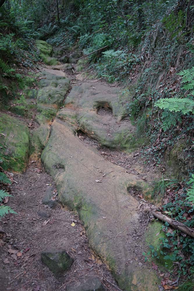Huh! Vuorta pitkin kävely on rasittavampaa kuin tasaisella. Luulin, että tämä kymppi kuluisi vähän nopeammin. Ei se mitään. Melkein pääsin kurkistamaan mäen reunan takaa San Sebastianin suuntaan. Toivon että se on San Sebastian. Sää on ollut hyvä: Puolipilvistä, enimmäkseen pilvistä, muutama tippa vettä. Ei ole ollenkaan liian kuuma, paitsi ylämäissä. Täällä ei ole juuri ketään. Koiranulkoiluttajia ja lenkkeilijöitä menee välillä ohi. Tulee mieleen menneet ajat, kun tätä on menty hevoskärryllä. Voi kuvitella ryövärit mäen yläosassa venaamassa. Mahtuisi tässä kaksi kärryä ohittamaan. Tällä hetkellä kalliota jalan alla.