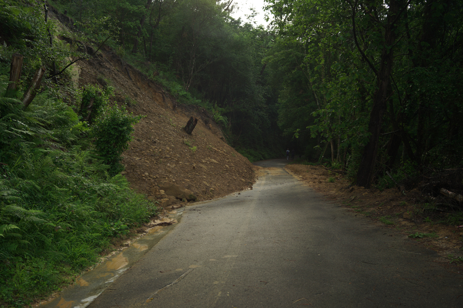 Maanvyörymä tiellä. Sähköjohdot ihan miten sattuu maassa.