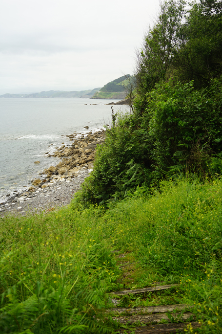 Deba oli kiva pikkukylä, jotenkin puolittain kesken tai puolittain hajonnut. Yllättävän paljon kauppoja, mutta ei mikään turistimesta. Olin kylän ainoassa alberguessa. Olen vähän kipeä sen edellisyön metsäseikkailun jälkeen, joten tarkoitus oli mennä hotelliin ensi yöksi, mutta ainoa hotelli oli täynnä. Ja tässä on sellainen ongelma, että seuraavan 24 kilometrin aikana ei ole kaupunkeja. Se on nyt vähän liikaa tässä tilassa. Joten, suunnitelma on, että hylkään Camino-reitin ja kävelen 5 kilometriä rantaa pitkin seuraavaan kaupunkiin. Siellä kuulemma on albergue, tai ainakin hotelli. Ja sitten pitää katsoa, missä kunnossa olen huomenna. Mutta ihan hyvä sää kävellä, pilvistä. Kunhan ei rupea satamaan. Löysin tuolta rannalta simpukankuoren, jonka laitan reppuun Caminon symboliksi, perinteen mukaisesti.