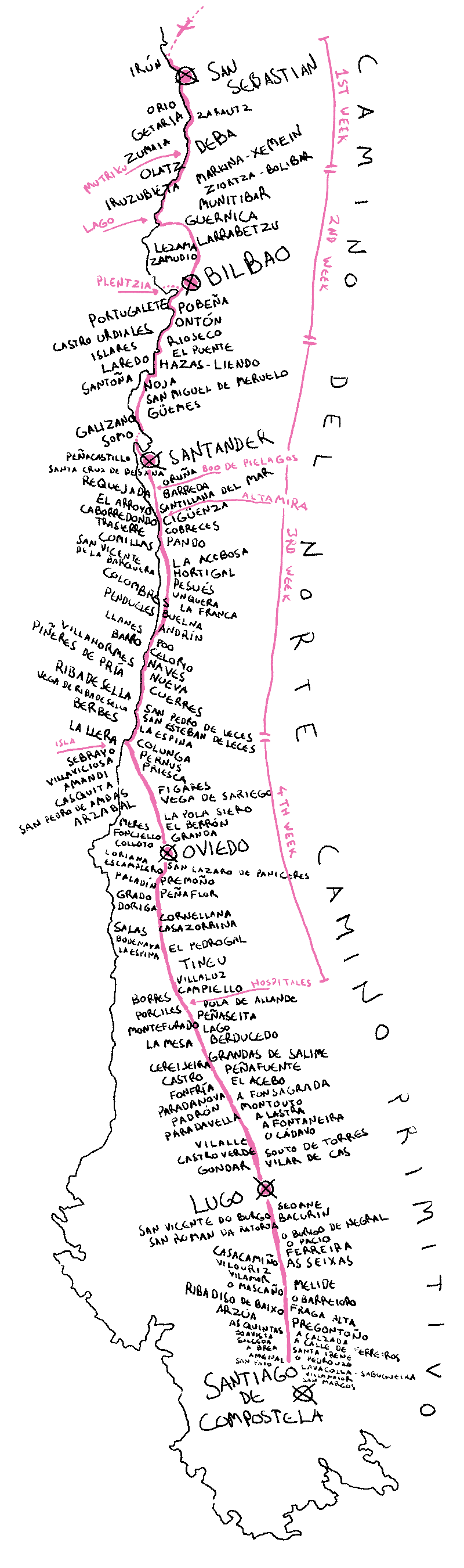 Eilen kävelin pitkään, yhdeksästä aamulla kymmeneen illalla. Ensin Lugoon 15 kilometriä ja sen jälkeen seuraava etappi kokonaan, 25 km. Aamulla Zora, Anna, Natalie ja Jeron, eli Team Athletic oli saanut minut kiinni. Olivat aamupalalla samassa mestassa, jossa olin yötä. Oli luksus-albergue, taidetta joka puolella. Tänään eivät kyllä saa minua enää kiinni, vaikka lähdin vähän myöhään liikkeelle. He kävelevät nopeasti, mutta lyhyempiä päiviä.