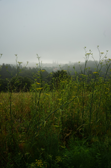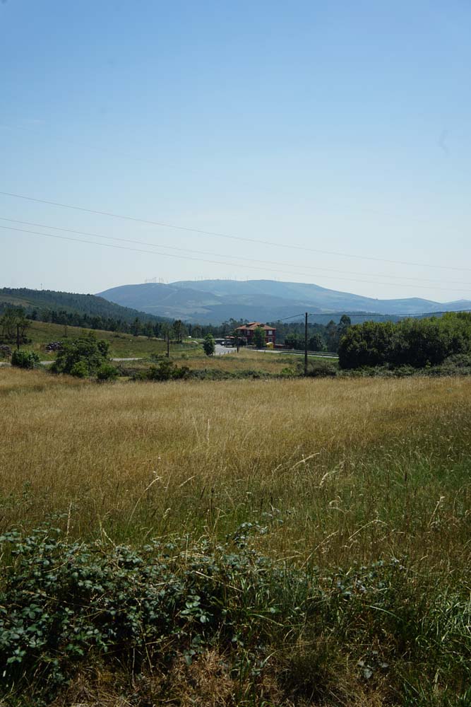 Kaukaa näkyy utuinen gradientti, joka on ehkä meri, ehkä ei. Vuoriakin näkyy, sinisiäkin vuoria. Mutta luulen, että ne on siellä Fisterran suunnassa. Hiki virtaa silmiin koko ajan.