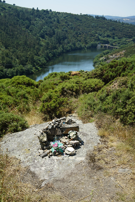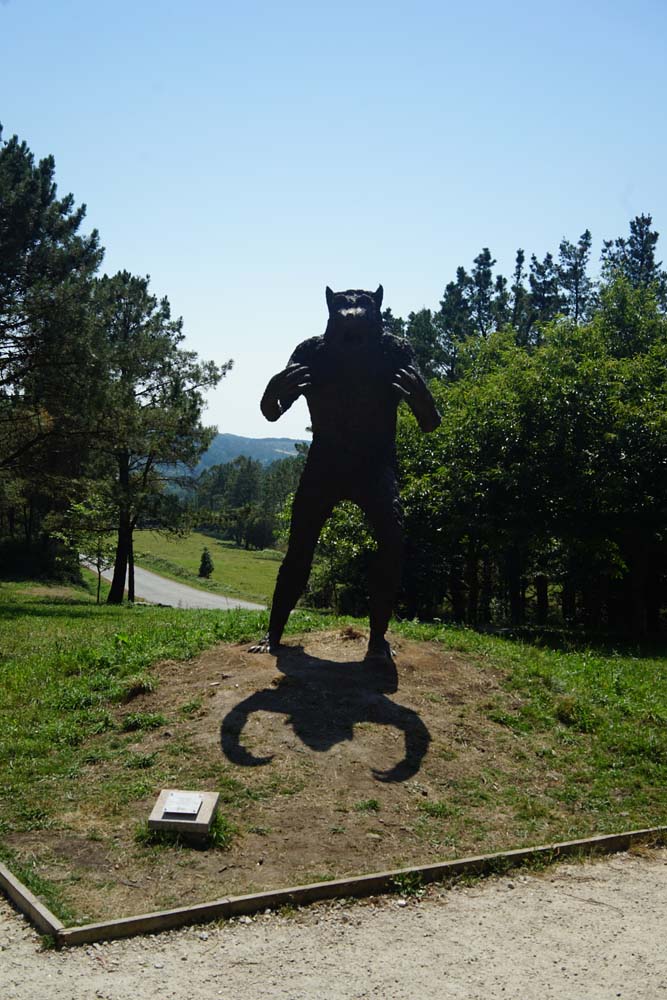 Pidin aurinkorasvaus- ja juomatauon ihmissusipatsaan vierellä. Se kuuluu jotenkin tähän Caminon mytologiaan. Eräs pappi oli saanut näyn sellaisesta täällä. Ei taaskaan ketään missään, kello on puoli viisi. Pidin taukoa 20 minuuttia, kukaan ei mennyt ohi. Ihan kuin ilma alkaisi tuoksumaan vähän mereltä. Huh, on kuuma.