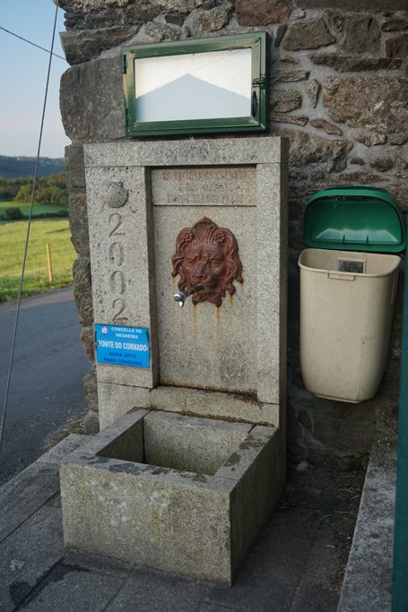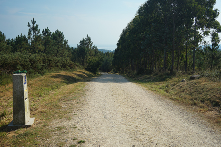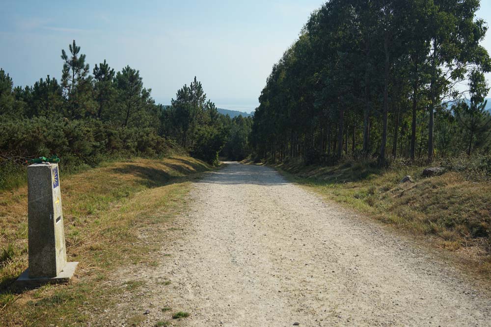 Kyllä se gradientti oli meri. Täältä mäen laelta sen näkee. Tosi erikoisen näköinen. Vielä olisi 20 kilsaa Fisterraan. Alamäkeä tästä lähtien, ja nyt on puiden varjoakin. Se lähde oli pelastus.