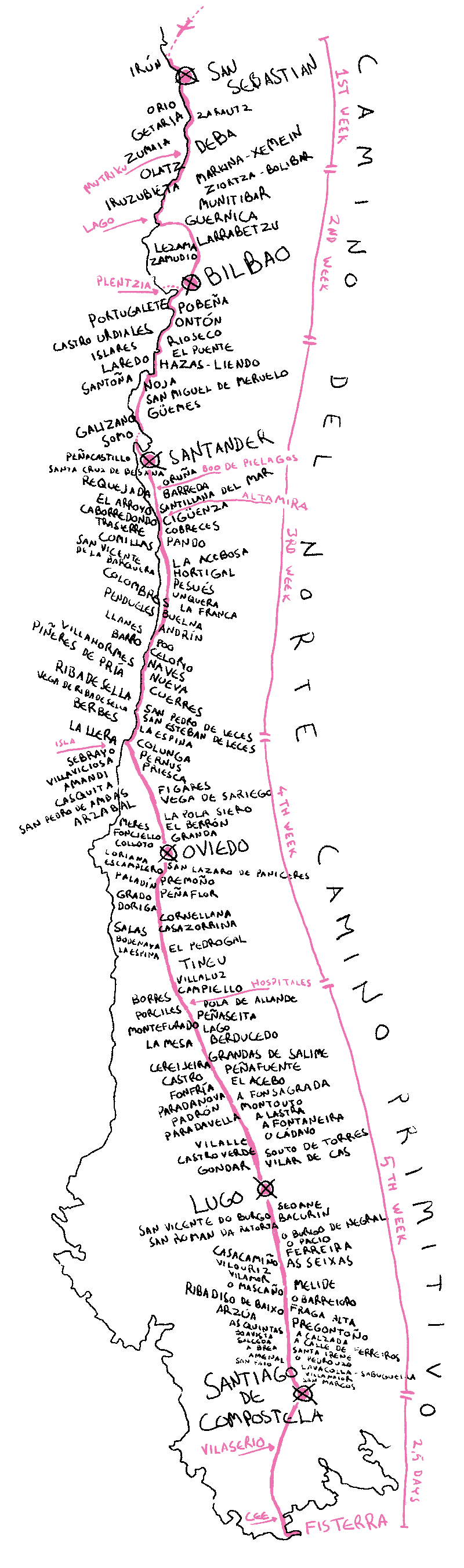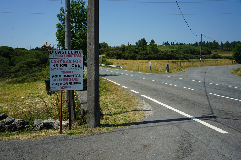 Menihän tämä vielä seikkailuksi. Ceessä ei ollut ollenkaan vapaita sänkyjä albergueissa, joten pitää lähteä kolmen kilometrin päähän. Siellä pitäisi olla albergue, vaikka sitä ei näy kartalla. Ja nyt tämä tie haarautuu, ja sitä haaraakaan ei ole kartalla. Ehkä minä tallaan Fisterraan. Muutamassa tunnissa sinne ehtisi. Jalat vain on lopussa ja väsyttää aika paljon tämän päivän jälkeen. Ehkä löydän telttapaikan.