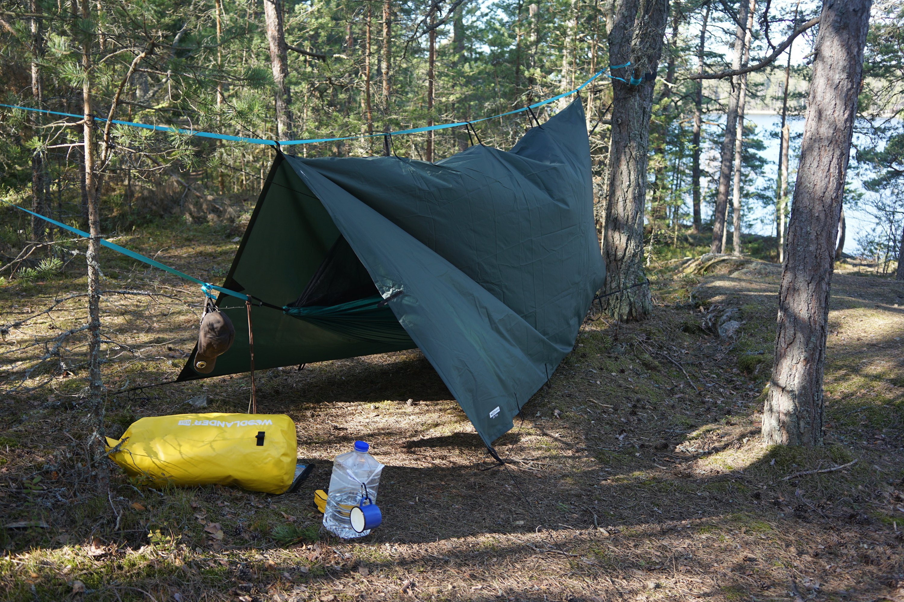 Toinen opetus. Pidä aina kokonainen vaatekerta kuivasäkissä. Olin pukenut varavaatteita päälleni odotellessani tuulen laantumista Suinonlahdessa. Nyt varavaatteistani osa oli märkinä. Raapaisin kasaan pikaisen katoksen ja koitin kuivatella vaatteita. Ne eivät kuivuneet iltaan mennessä. Saman tien hankin myös polttopuita ja tein nuotion. Olin rantautunut tosi hyvään paikkaan parin kallion väliselle pienelle rannalle, jossa oli sopivat puut riippumatolle, ja joka oli täysin tuulen suojassa.